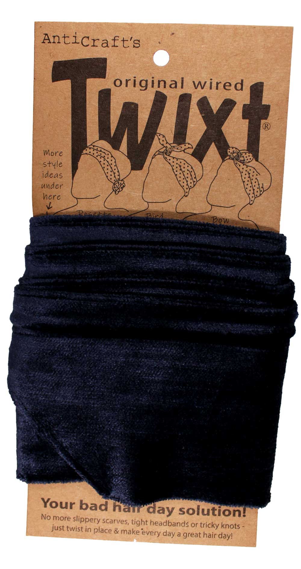 Twixt - the hair styling revolution! No more knots! This wired head wrap means you just twist it to secure and you're out the door looking divine. No more headaches from tight headbands, no more sliding scarves, no more tricky knots... just comfortable, fabulous, effortless style!