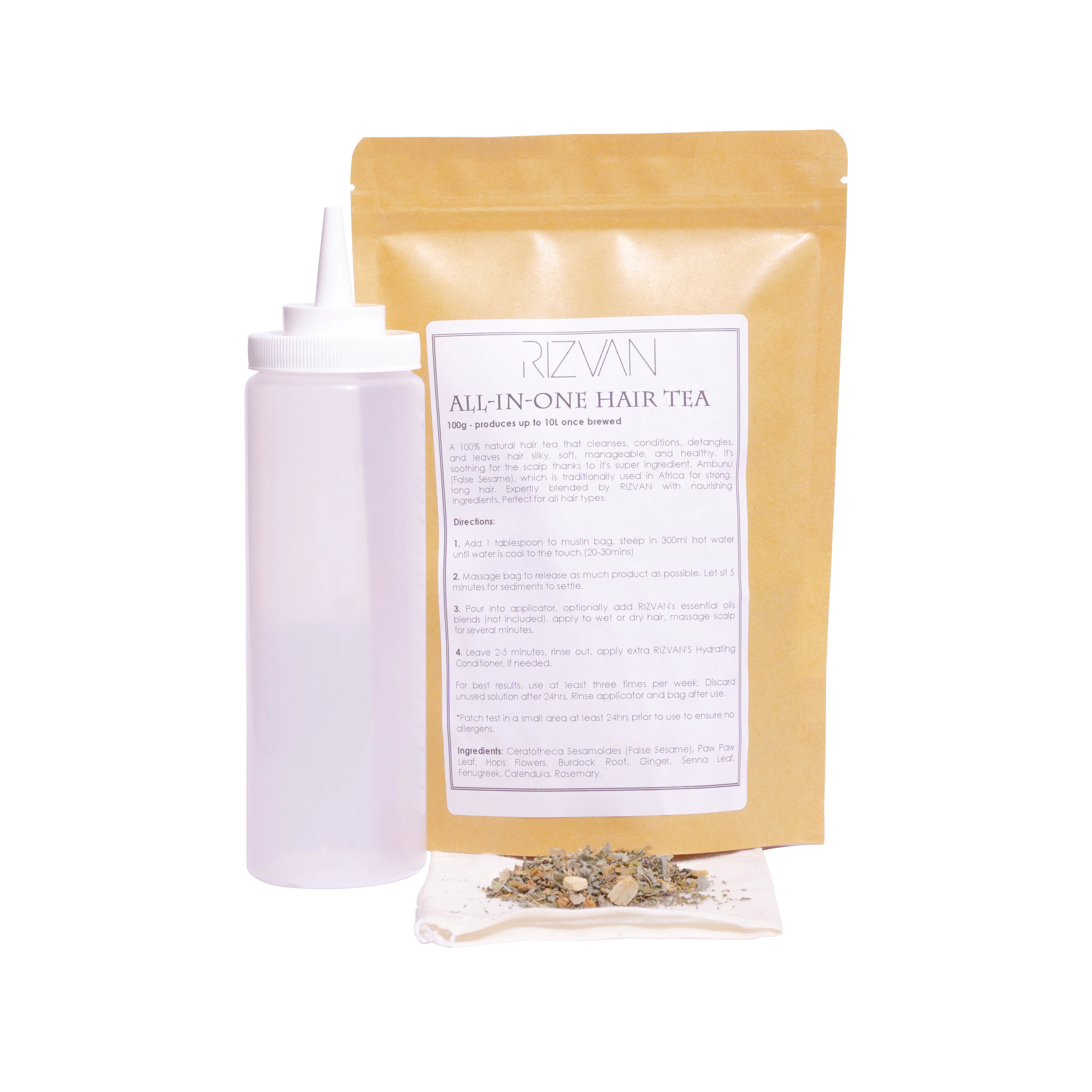 1 – Add 1 heaped tablespoon of Rizvan Hair Tea into muslin bag provided. Close bag tightly and let steep in 300mls of hot water until water is cool to the touch (a safe amount of time is at least 30mins after)