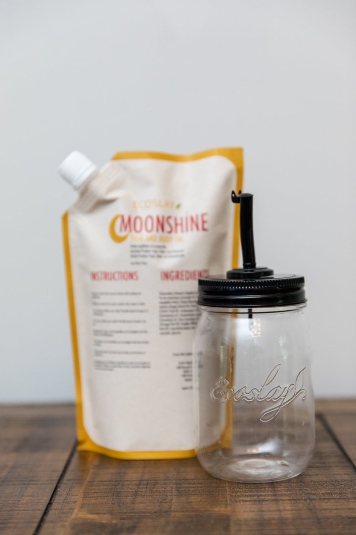 Moonshine now comes in a waste reducing pouch that you can decant into your existing moonshine bottle, by purchasing a jar and pour top, or by using any jar you may already have at home.